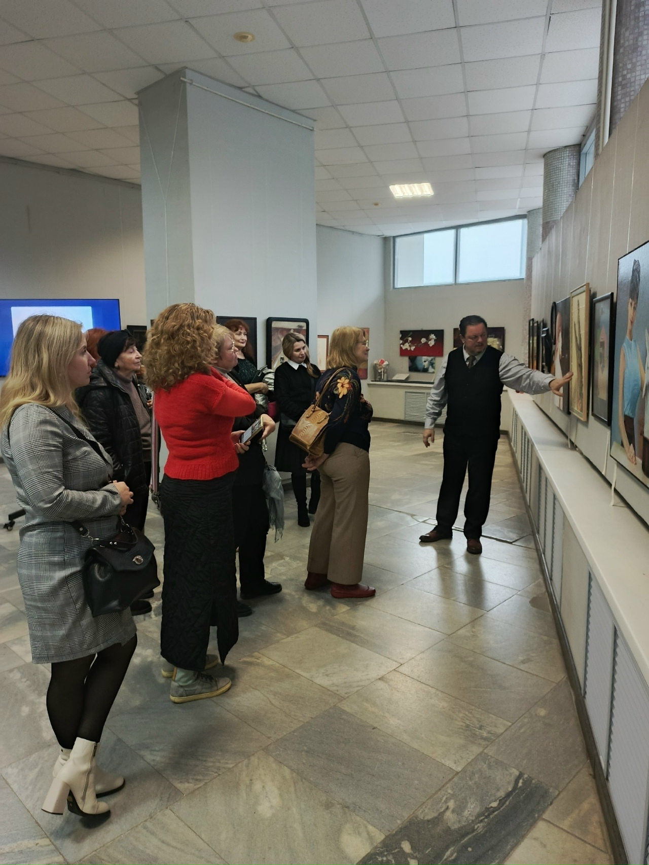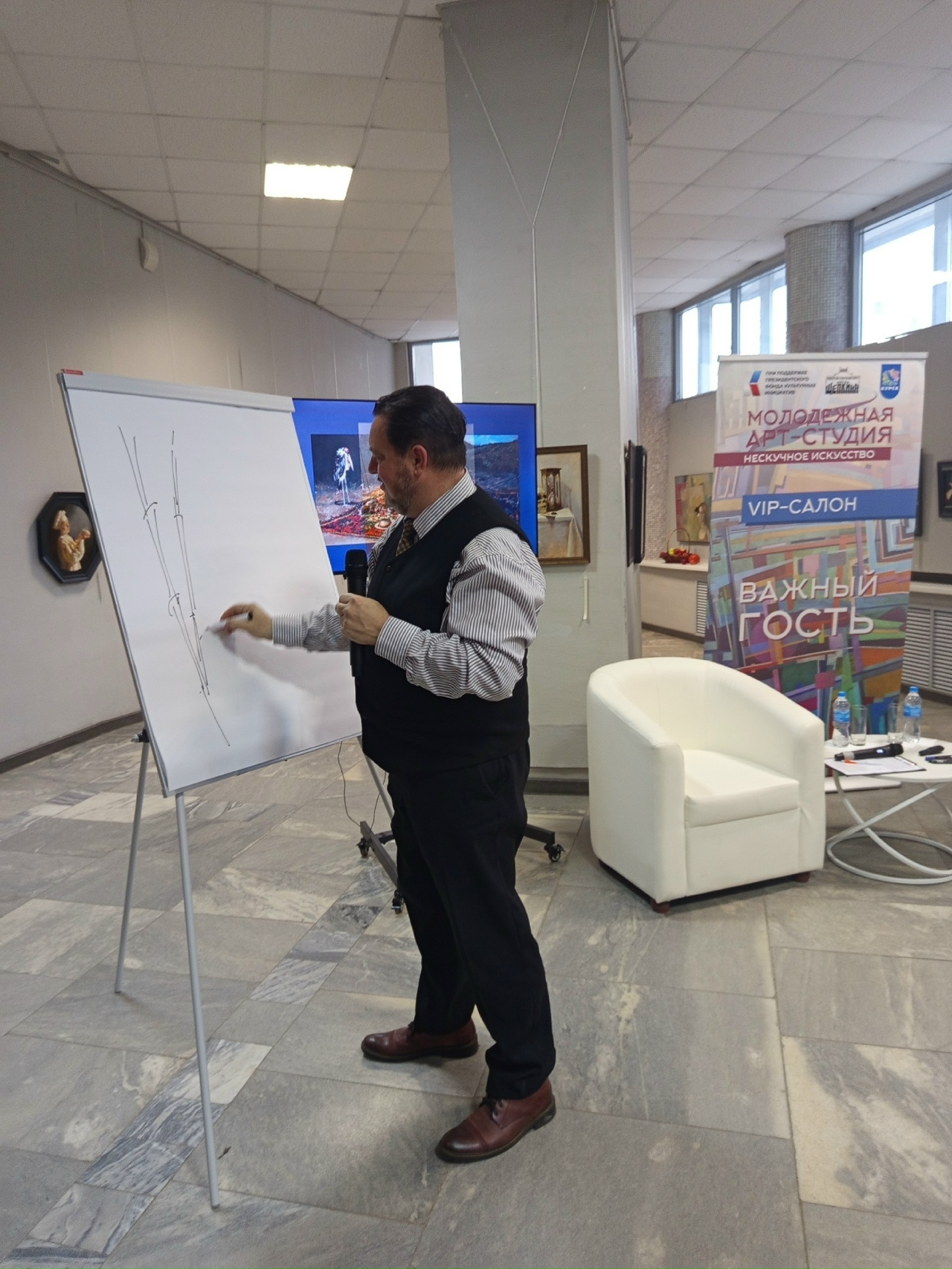 В завершение встречи он провел увлекательную экскурсию по выставке современных курских художников "НОЙ ПЛЮС", поделившись своим видением и пониманием представленных работ.